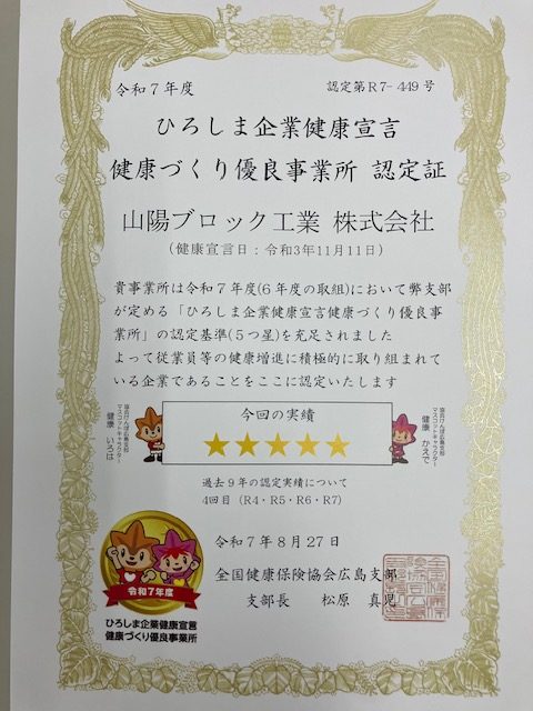 ひろしま企業健康宣言「健康づくり優良事業所 認定書(ゴールド)」をいただきました。